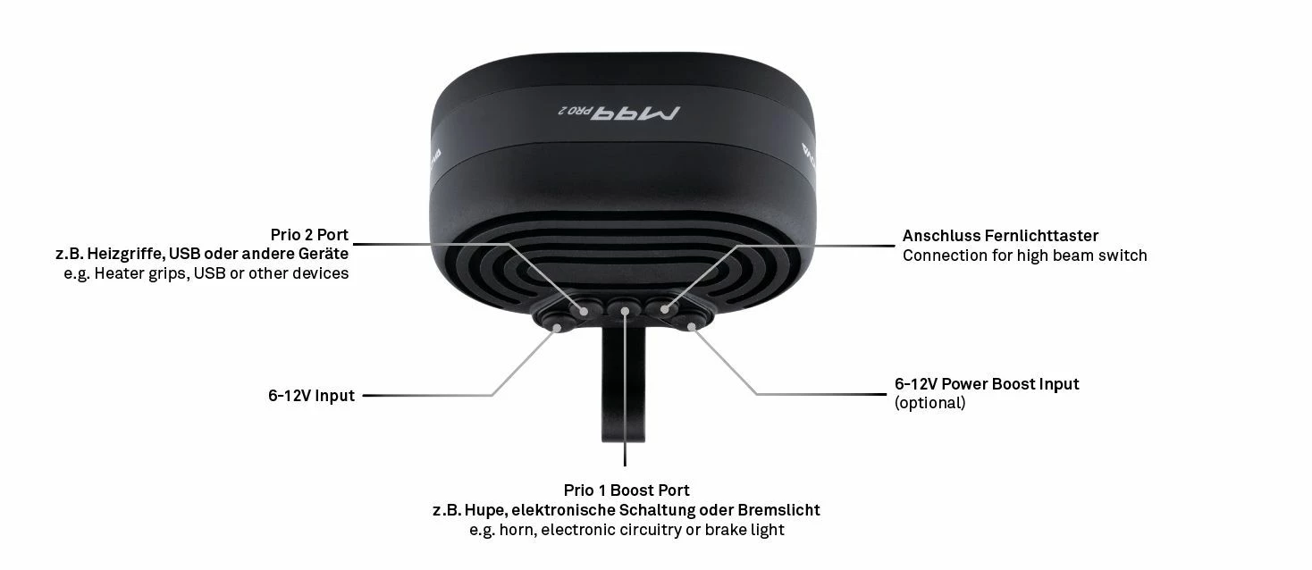 The Supernova M99 PRO 2 front light – E25 sets new standards with up to 3000 lumens and 450 lux. The headlight is one of the brightest on the market and approved for pedelecs up to 25 km/h. Thanks to the intelligent light sensor, the M99 PRO 2 automatically switches between daytime running light and low beam. In addition, the Supernova front light has a side light, which provides even more safety and visibility in road traffic. To use the full power of 3000 lumens, you need the Supernova Power Boost Connector.