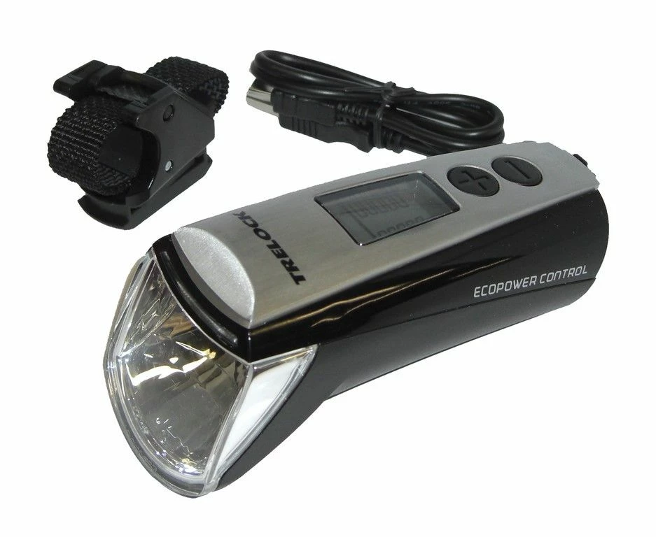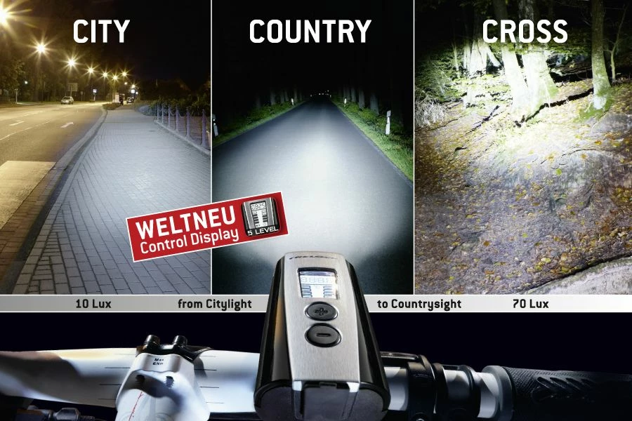 This innovative headlamp with lithium-ion rechargeable battery perfectly illuminates the road surface. It can be regulated in 5 steps from 10 to 70 lux. The integrated LCD display shows the light intensity, the battery capacity and the remaining battery life in hours and minutes.